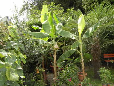Mit Bananenstauden und natürlich auch Palmen(in diesm Fall eine Hanfpalme) hat man ,ruckzuck ein bischen Urlaubsatmosphäre in den Garten gezaubert.